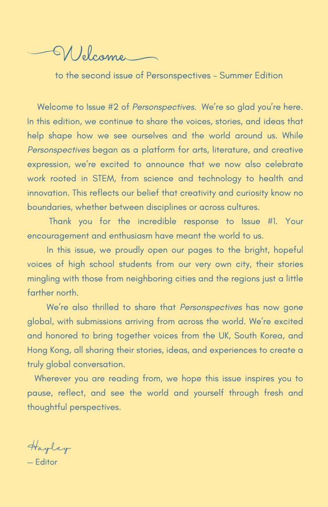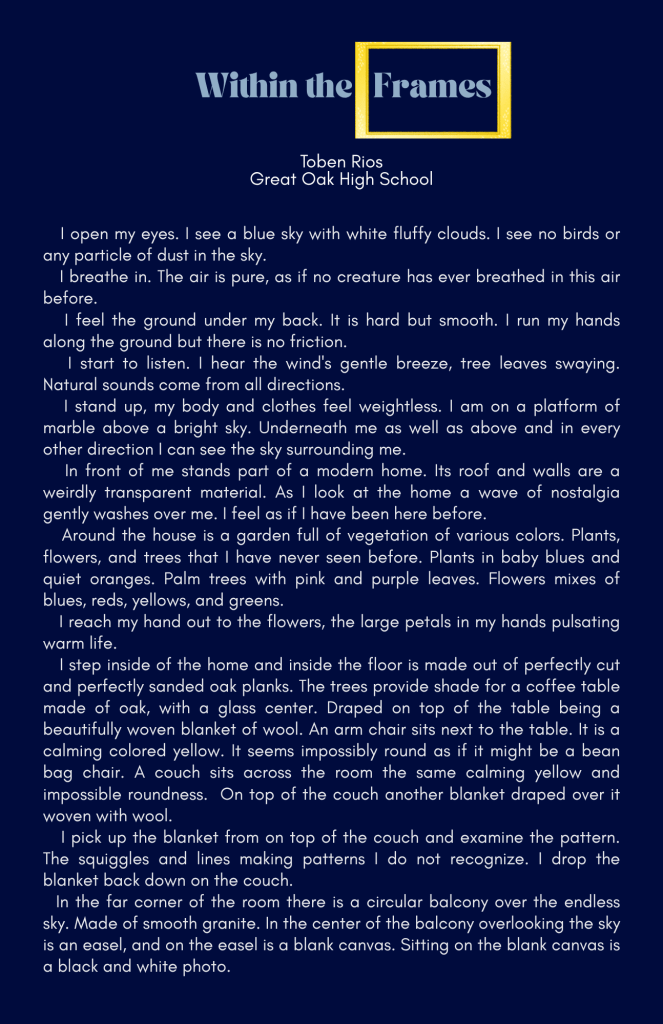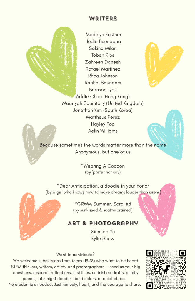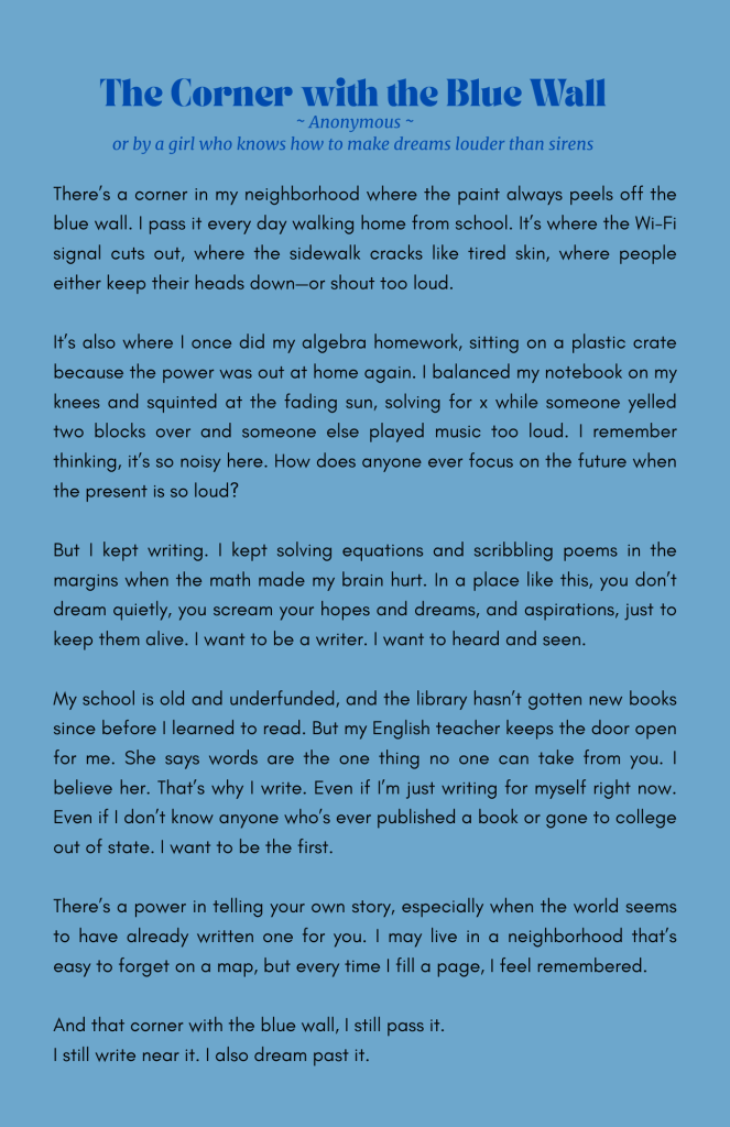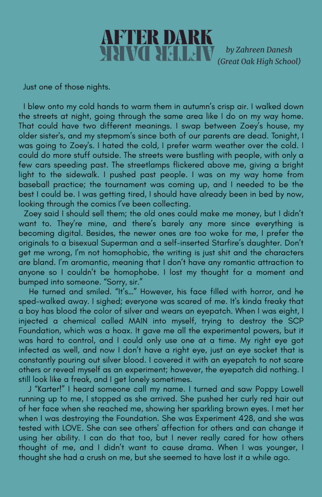 Our creative writing and arts section showcases bold voices, unique stories, and stunning visuals from teens who dare to dream, create, and inspire.